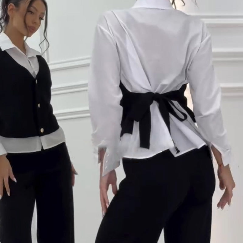 FAUX TWO-PIECE DESIGN - This set features a creative faux two-piece design that effortlessly combines a long-sleeved shirt and a vest with a stylish layered effect. It gives you the look of wearing a shirt and vest combo without the need for multiple pieces, making it an incredibly convenient and chic choice for everyday wear.