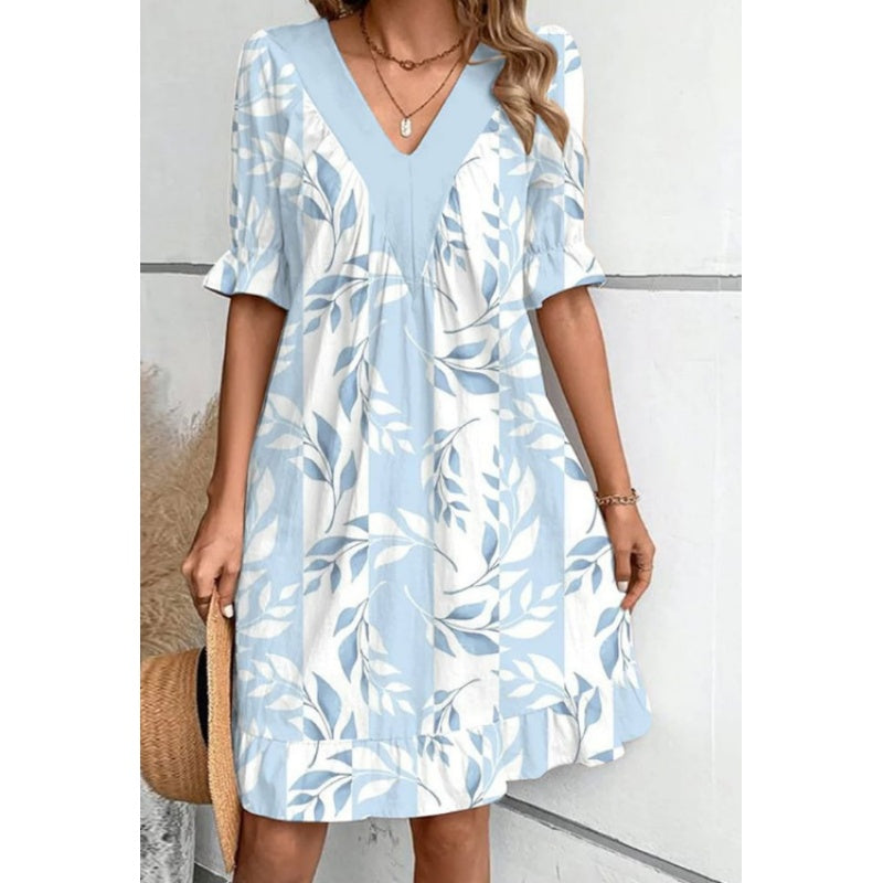 RUFFLE SHORT SLEEVES & HEM: The playful ruffled short sleeves and hemline offer a feminine, chic touch, adding movement and charm to the dress.